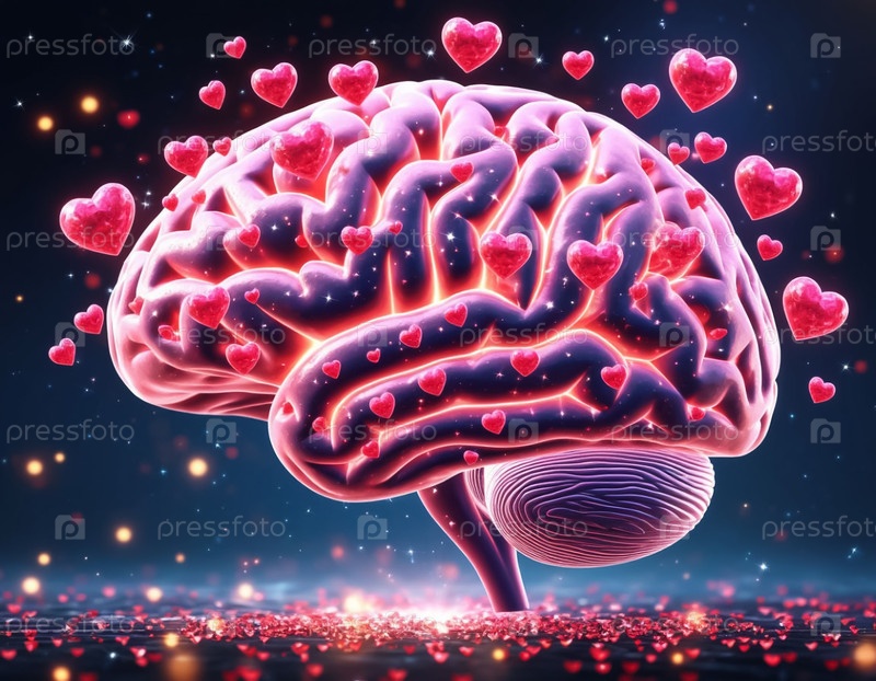Человеческий мозг, наполненный сердцами - это концепция положительных эмоций