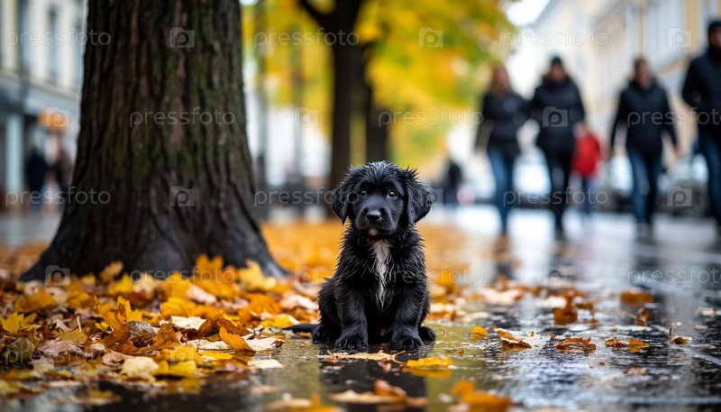 Бездомный щенк в городе под дождем, генерирующий ИИ