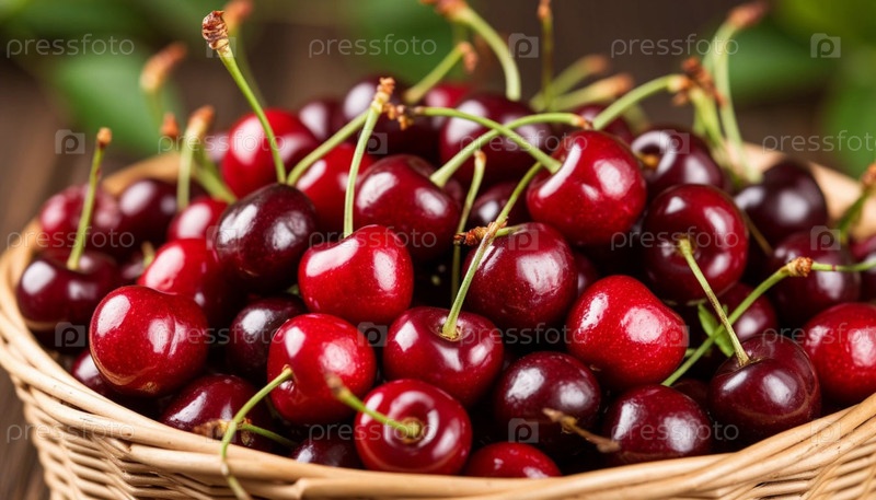 Зрелые вишни в корзине из косточки