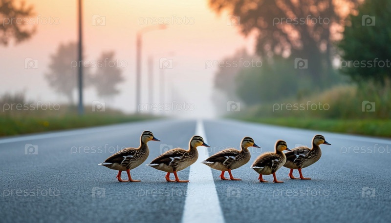 Утки пересекают асфальтированную дорогу в одиночку на рассвете