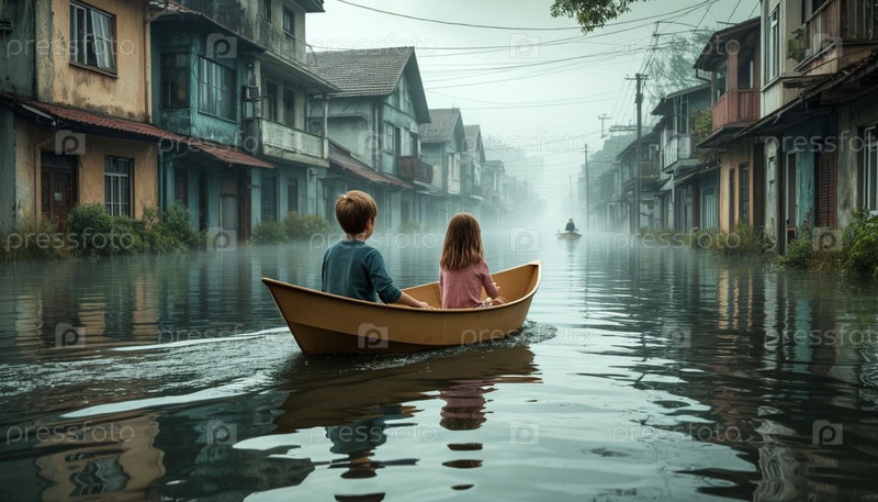 Мальчик и девочка плывут на бумажной лодке через затопленный город