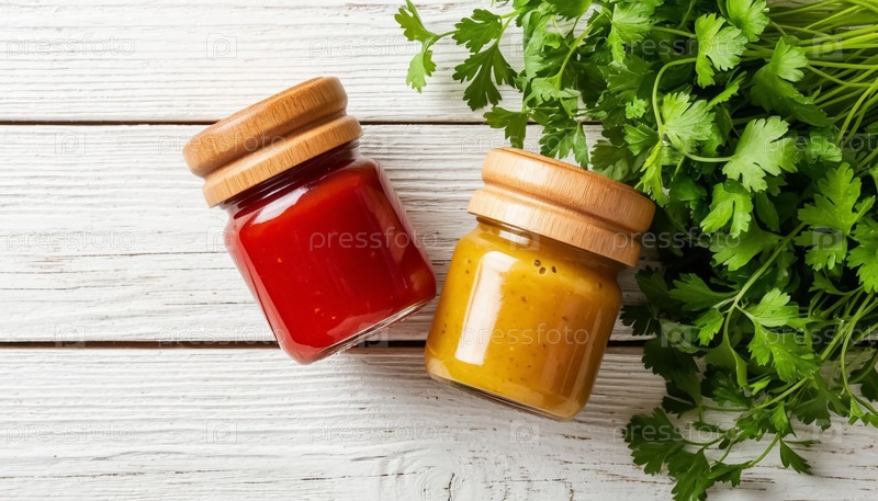 Консервы с кетчупом и горчицей на белом деревянном фоне