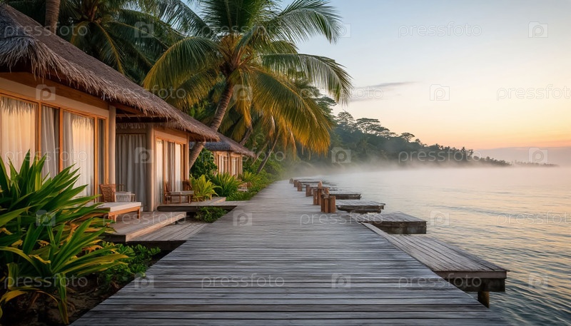 Сламчатый бунгало на берегу моря в туманное утро. Реклама для отдыха в Азии. Туристический сезон