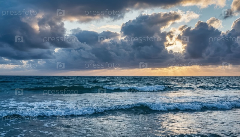 Морской пейзаж с скалистым берегом. драматический шторм, облака