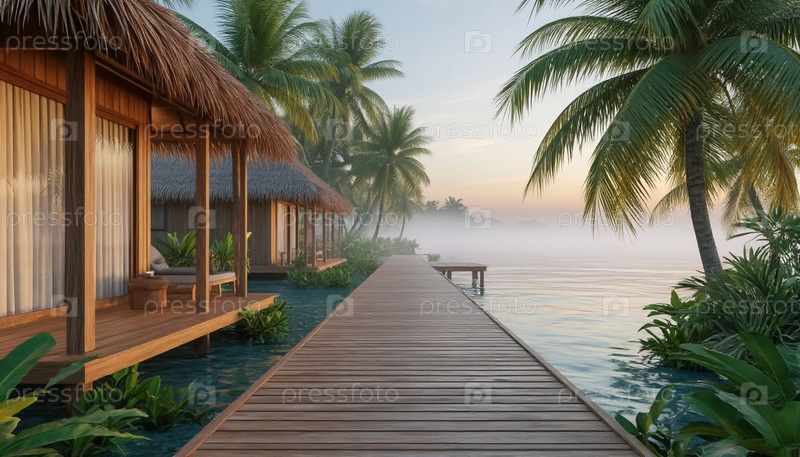 Сламчатый бунгало на берегу моря в туманное утро. Реклама для отдыха в Азии. Туристический сезон