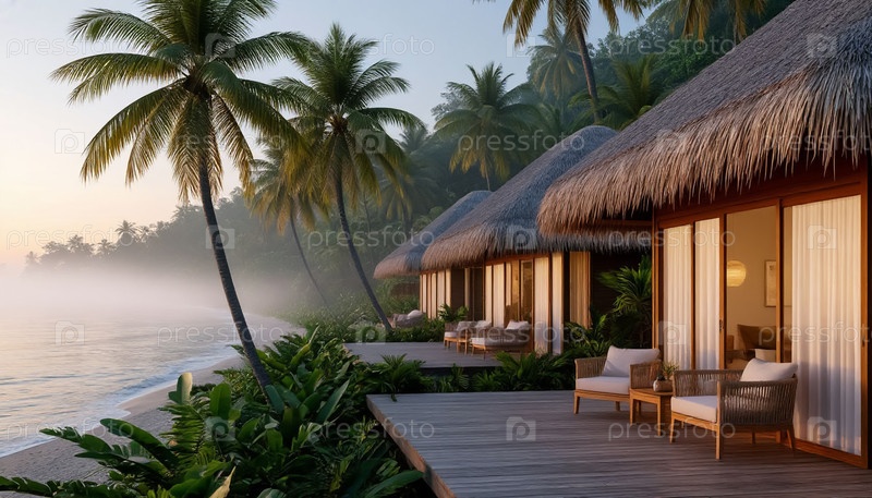 Сламчатый бунгало на берегу моря в туманное утро. Реклама для отдыха в Азии. Туристический сезон