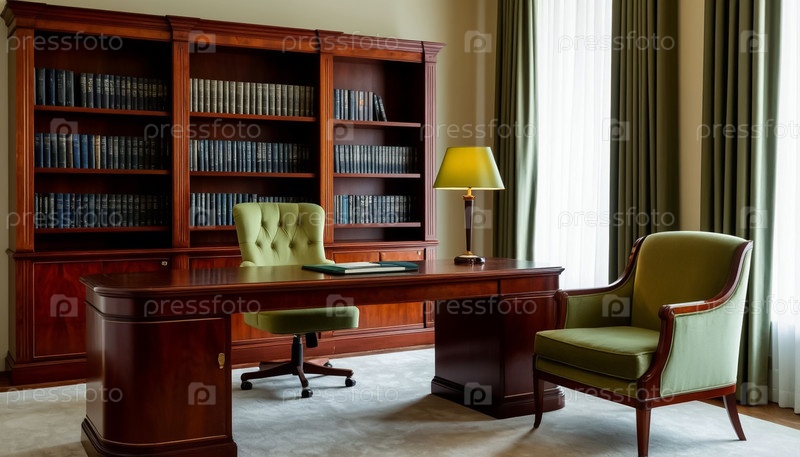 Интерьер кабинета выполнен из красного твёрдого дерева