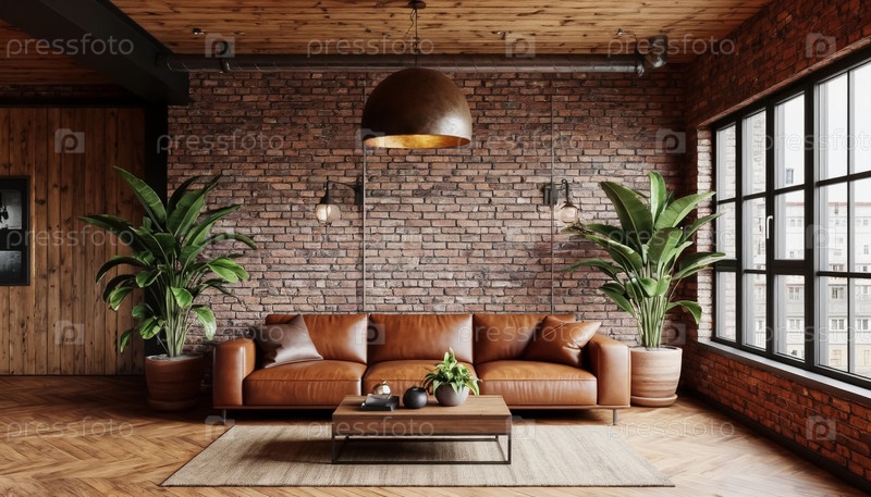 Современный интерьер гостиной с кожаным диваном