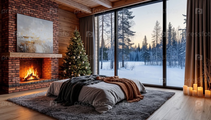 Уютная скандинавская спальня с камином, рождественской елкой и панорамным окном
