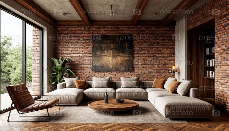 Современная гостиная, кирпичные стены, удобные диваны с подушками, панорамные окна. загородный коттедж, отель. генерация ИИ