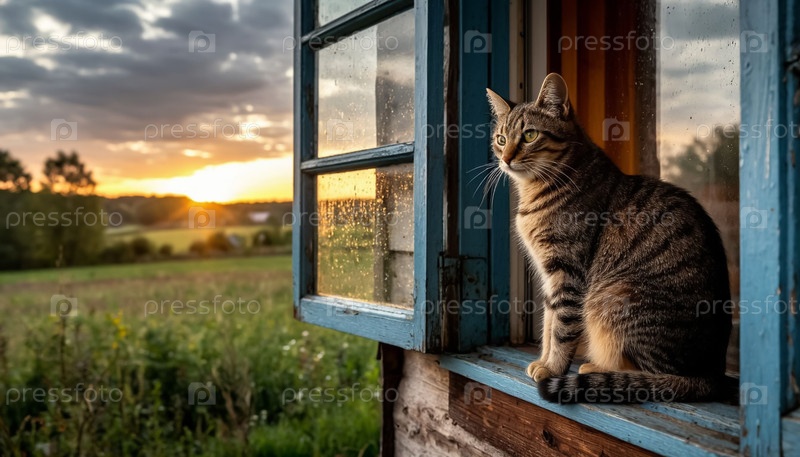 Кошка, сидящая на окне с видом на деревню на рассвете