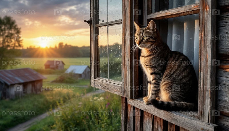 Кошка, сидящая на окне с видом на деревню на рассвете