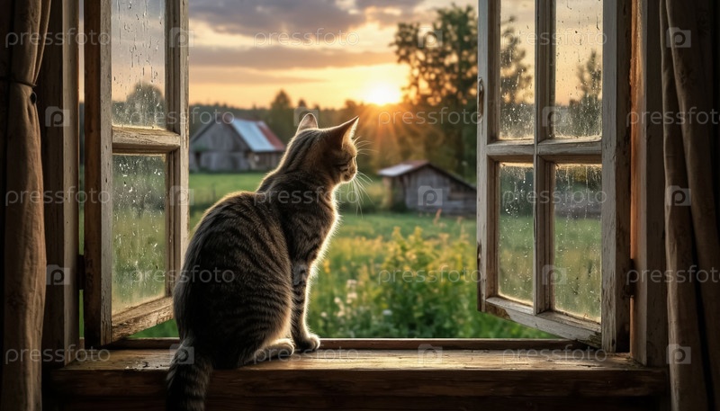 Кошка, сидящая на окне с видом на деревню на рассвете