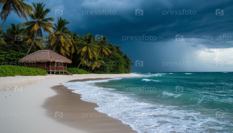 Красивый пляж с белым песком, пальмами и бунгало во время шторма
