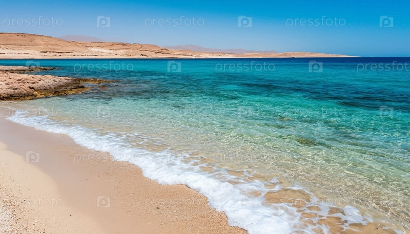 Красивый морской берег - прозрачные мягкие голубые волны, идущие вдоль светлого песка, много соли на берегу