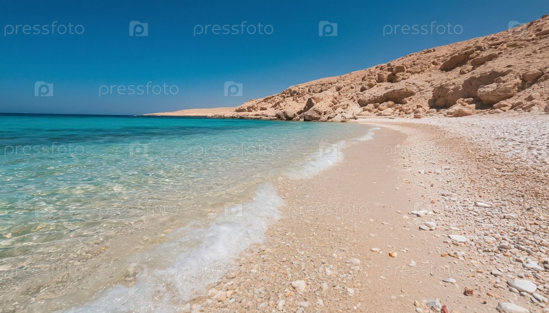 Красивый морской берег - прозрачные мягкие голубые волны, идущие вдоль светлого песка, много соли на берегу