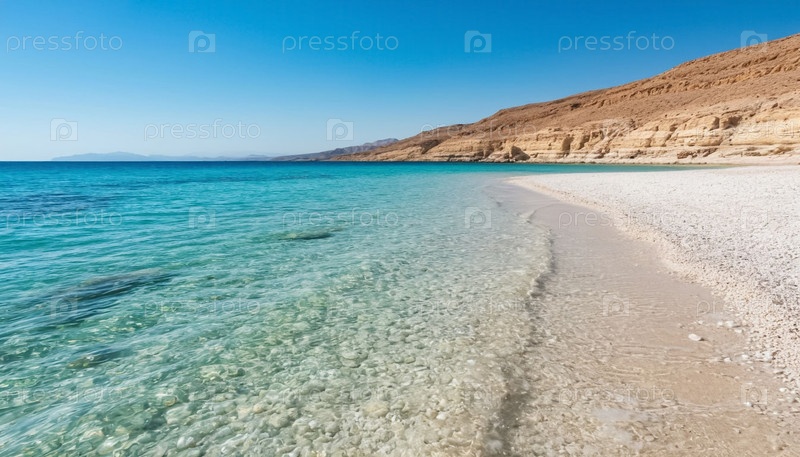 Красивый морской берег - прозрачные мягкие голубые волны, идущие вдоль светлого песка, много соли на берегу