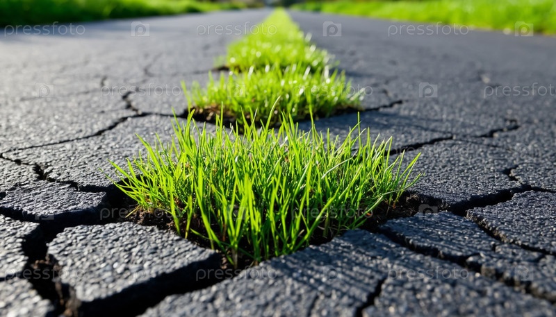 Свежая зеленая трава растет через трещины в асфальте