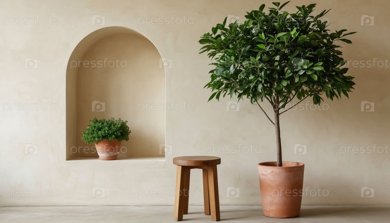 Деревянный стул и дерево в плантаторе на бежевой стене