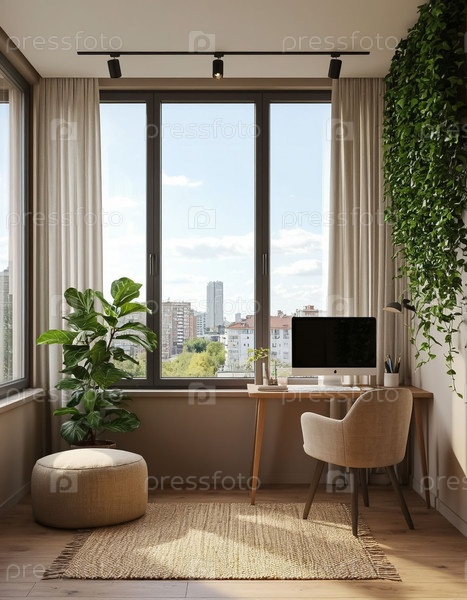 Интерьер балкона был преобразован в офис, современный уютный дизайн