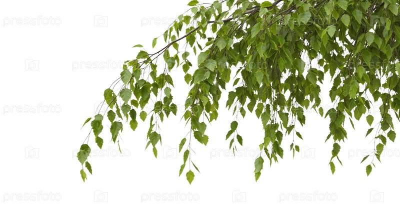 Ветви березы с зелеными листьями висят на прозрачном фоне