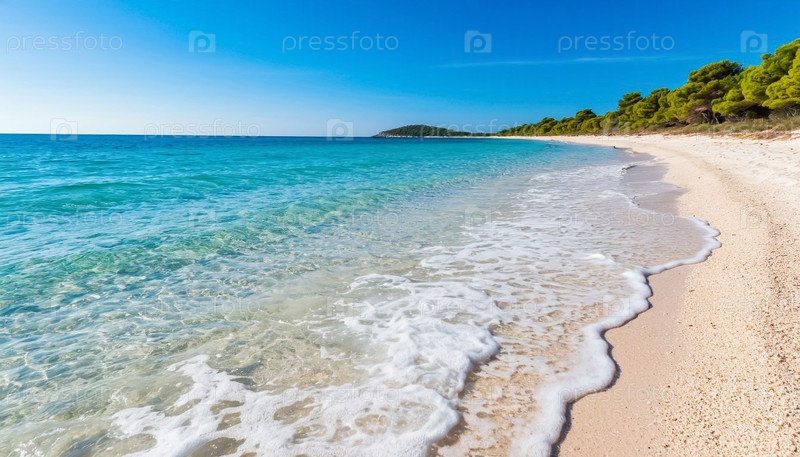 Красивый морской берег - прозрачные мягкие голубые волны, идущие вдоль светлого песка, много соли на берегу