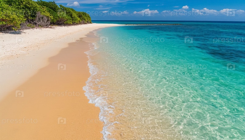 Красивый морской берег - прозрачные мягкие голубые волны, идущие вдоль светлого песка, много соли на берегу