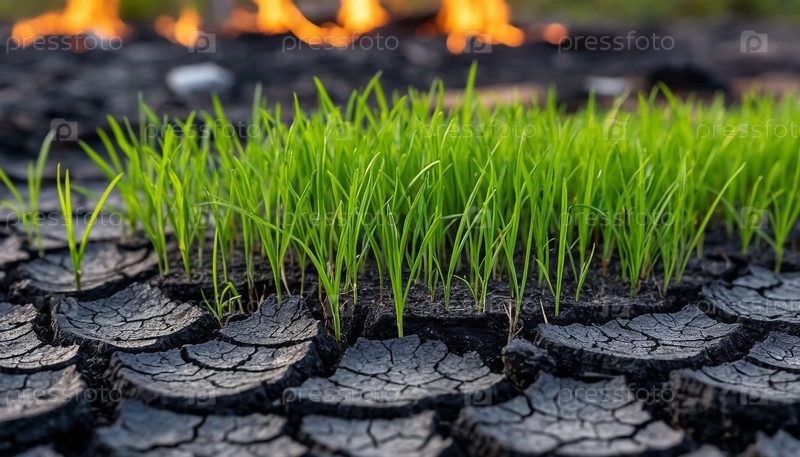 Свежая зеленая трава растет через сухую, трещину почвы