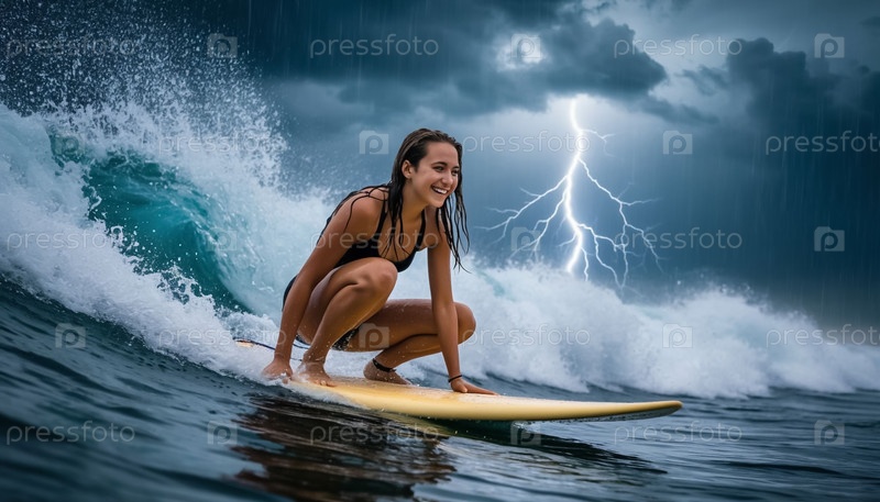 Красивая счастливая девушка с мокрыми волосами в море на доске для серфинга во время грозы и шторма