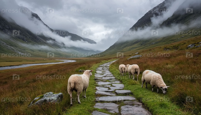 Овцы в горах на дороге над облаками