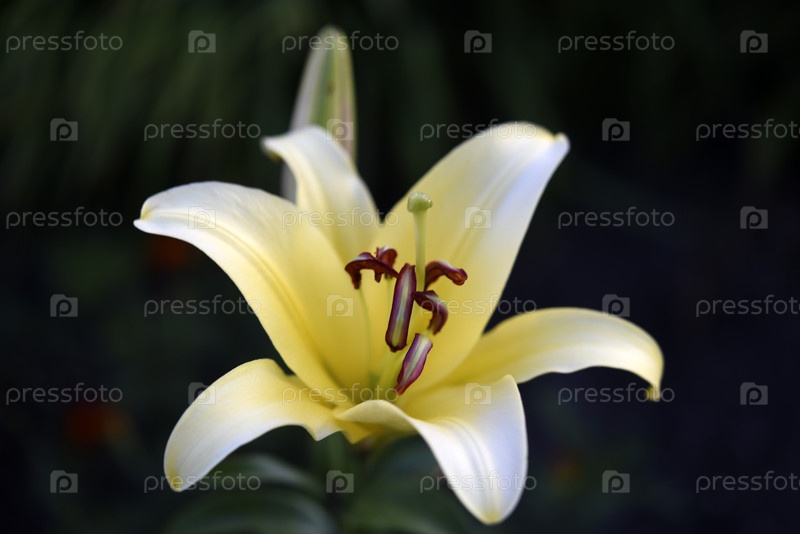 Светло-желтый цвет лилии на темном фоне. светлый цветок в темном саду. лилия