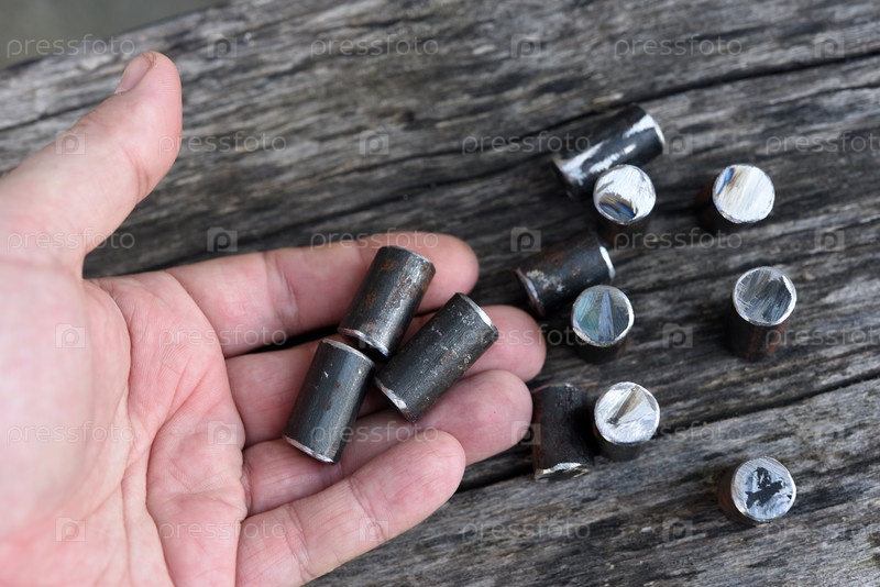 Металлические стержни в руке.Разрежьте металлические фитинги