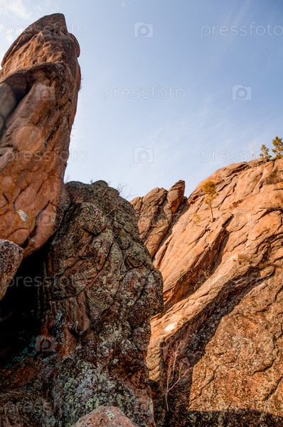 Ландшафт сибирских гор Столби, вершина горы в туманное лето