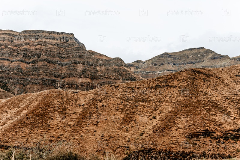 Пейзаж гор Дагестана, горный хребет в тумане летом России