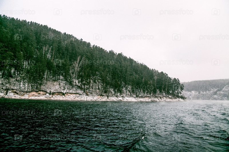 Красноярское водохранилище на реке Енисей, зимний пейзаж в пасмурный день в Сибири