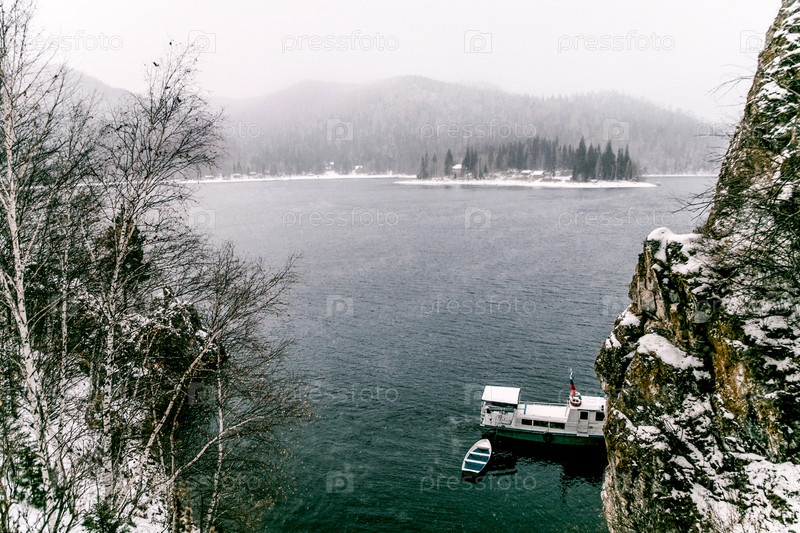 Красноярское водохранилище на реке Енисей, зимний пейзаж в пасмурный день в Сибири