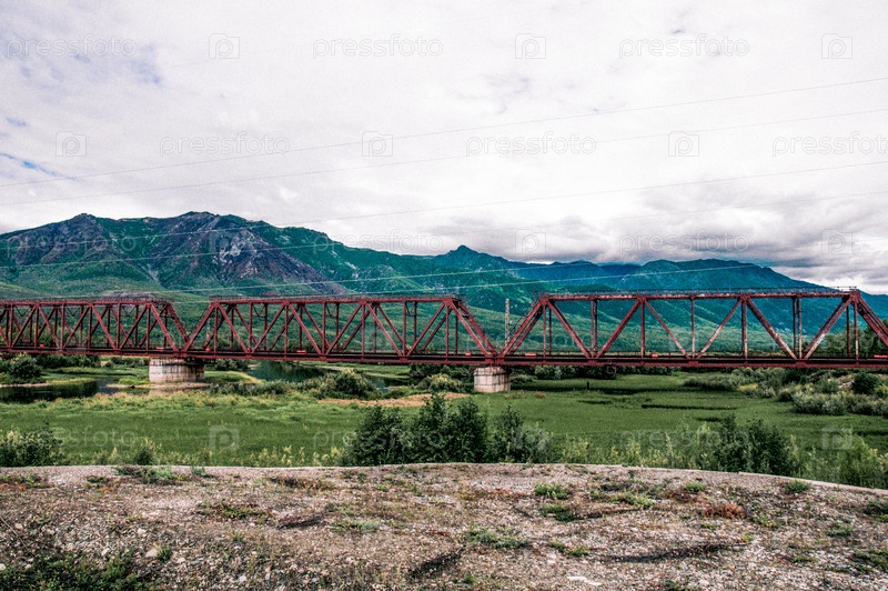 Железнодорожный мост для перевозки поездов через небольшую реку в Сибири, Россия