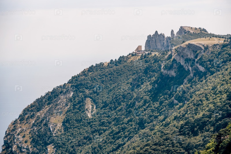 Пейзаж гор Крыма, панорамный пик Ай-Петри в туманное лето
