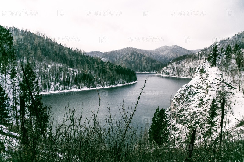 Красноярское водохранилище на реке Енисей, зимний пейзаж в пасмурный день Сибири