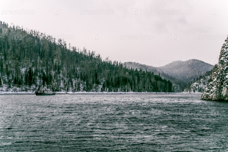 Красноярское водохранилище на реке Енисей, зимний пейзаж в пасмурный день в Сибири