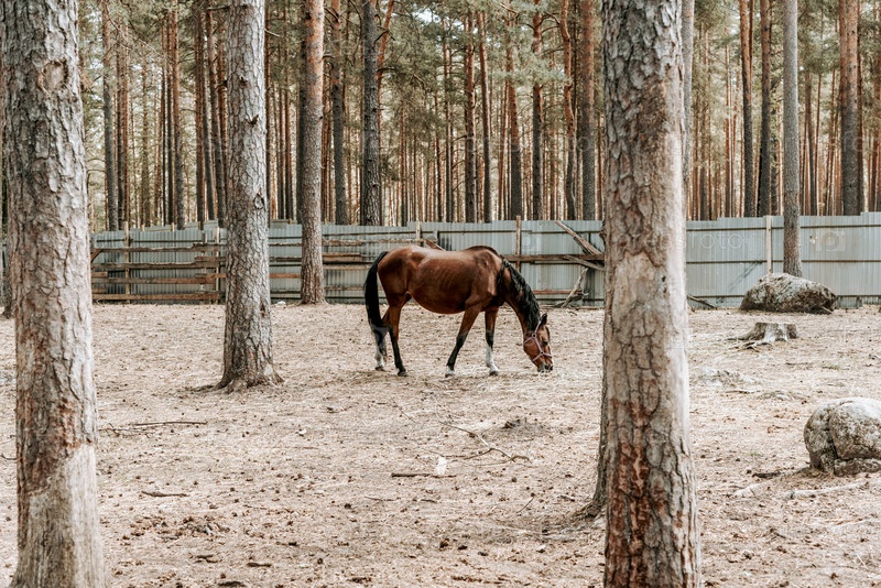 Стадо красивых лошадей, пасущихся на зеленой луге в солнечный летний день