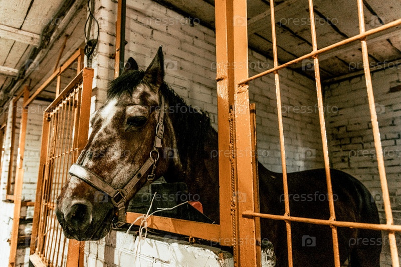 Домашние лошади стоят в конюшне на ферме, коричнево-красная лошадь ждет верхового
