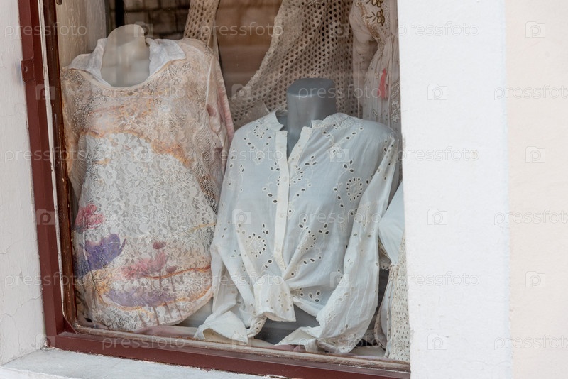 Манекены с женскими рубашками и платьями стоят за стеклянным окном магазина одежды