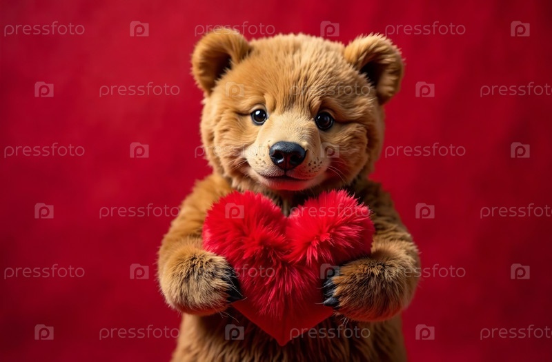 Карточка на День святого Валентина, медведь с пушистым красным фоном сердца