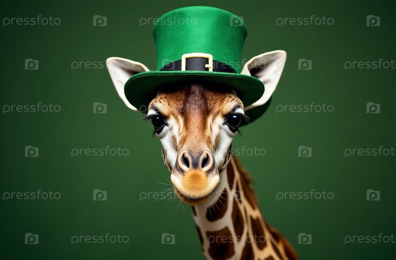 Жираф в традиционном зеленом ирландском костюме с шляпой, открытка на День Святого Патрика