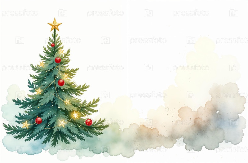 Созданный искусственным интеллектом украшенная рождественская елка стоит в снегу, новогодняя открытка с свободным текстовым пространством