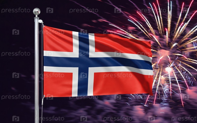 Национальный флаг Независимости Норвегии, фоновый фейерверк. генеративный AI