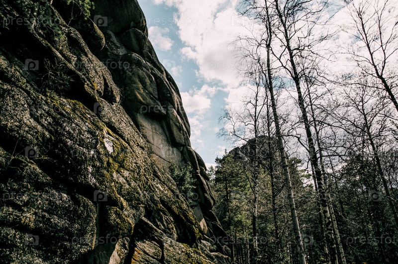 ландшафт сибирских гор Столби, вершина горы в тумане летом