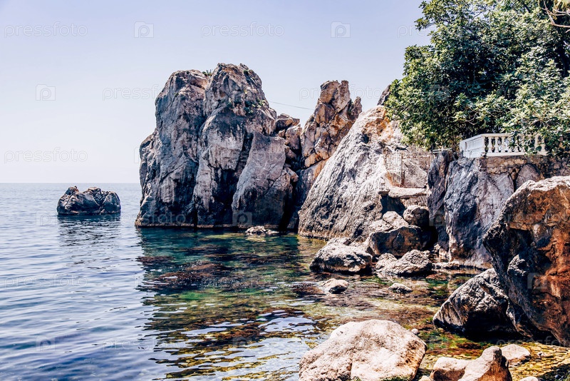 Вид на побережье Черного моря из музея Чехова-Дача в Гурзуфе, Крым, лето в солнечный день