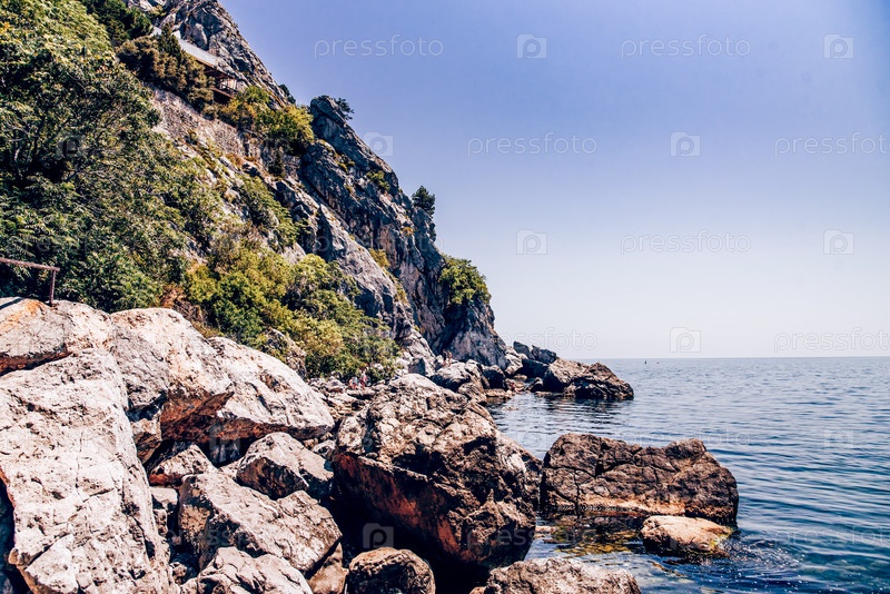 Вид на побережье Черного моря из музея Чехова-Дача в Гурзуфе, Крым, лето в солнечный день